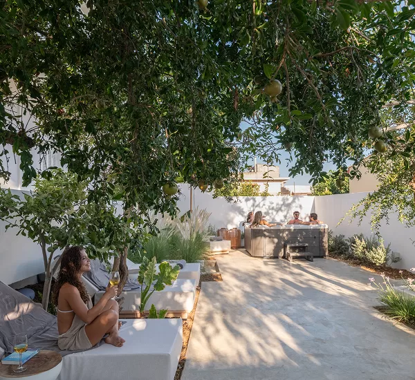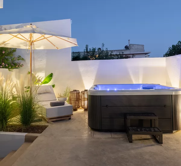 - Ιδιωτική αυλή με Jacuzzi (4-5 ατόμων) και ντουζ