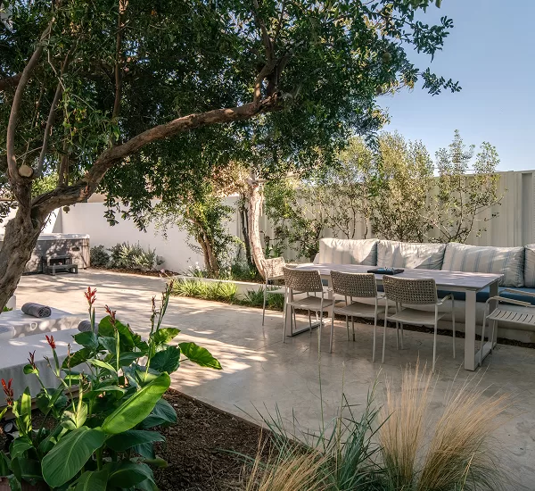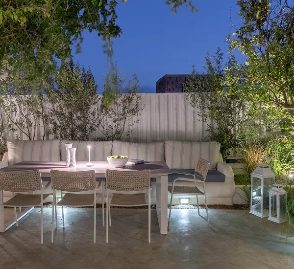 - Τραπεζαρία στην αυλή και άνετες premium ξαπλώστρες